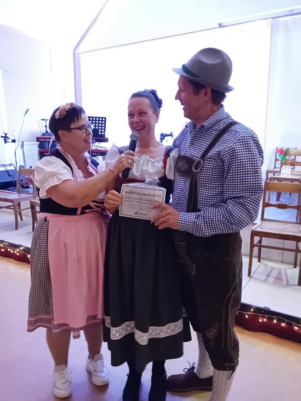 Oktoberfestien arpajaisten päävoitto oli Levikaira Apartmentsinn viikon loma yhdeksän hengen mökissä Levillä. Keskellä onnellinen voittaja turkulainen Eeva Andersson jolle käynti Levillä tulee olemaan ensimmäinen, vasemmalla juontaja Nökö Tasanen ja oikealla lahjoittajan edustaja Jaakko Kallio. Kiitokset vielä kaikille arpoja ostaneille!