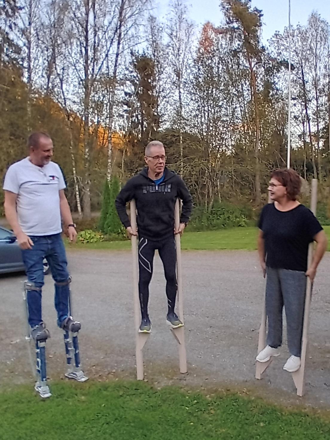 Henrikin koulun Vanhempainyhdistys oli keksinyt että puujalat olisivat mukava välituntiaktiviteetti ja esittivät toiveensa Nousiaisten Lionsklubille. Harri Salminen Masarasta tarttui toimeen ja valmisti sellaiset. Kuvassa Harri omine jatkojalkoineen, ylläpitäjä ja Salmisen Satu näyttämässä että pystyssä yhä pysytään. Jalat on toimitettu Vanhempainyhdistykselle ja ilmaantunevat välituntikäyttöön lähiaikoina.